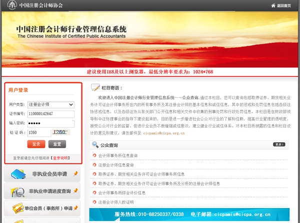 其一:通过“中国注册会计师行业管理信息系统(会员版)”报名。注册会计师在IE浏览器中访问行业管理信息系统(会员版)(地址:http://cmispub.cicpa.org.cn/cicpa2_web/),在如下登录页面选择用户类型(注册会计师),输入会员证书编号、密码、验证码后,点击登录,进入会员首页。