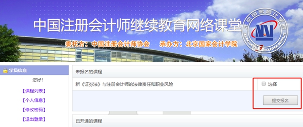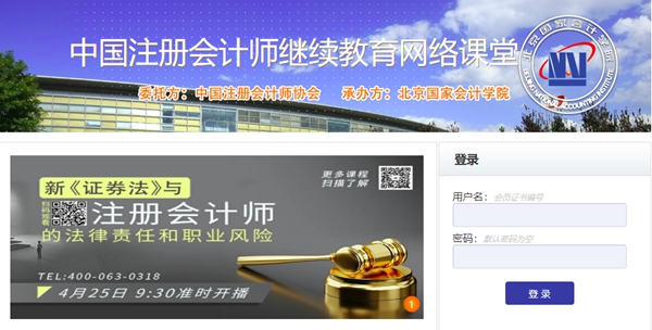 通过国会在线“半岛在线 继续教育”培训专区报名。地址:https://cpakt.e-nai.cn/,在如下图所示,在页面输入用户名(会员证书编号),无需输入密码,点击登陆进入网络课堂首页。